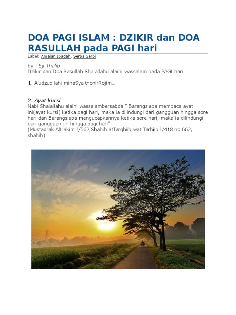 Pagi adalah awal dari segala aktifitas kita perlu mengawalinya dengan doa menyambut pagi. Ya allah berkahilah umatku di waktu paginya hr. Doa adalah senjata kaum mukmin untuk kekuatan jiwa ketenangan hati dan memohon keberkahan serta perlindungan allah swt.